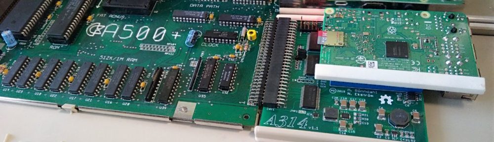 A couple of weeks ago I managed to get my hands on a prebuilt A314 card for my Amiga 500+. I was lucky to get hold of a card from Marcin, one of the creators. It was the latest v1.1 version shipped together with a Raspberry Pi 3B, and a 3D-printed insulation protection for the back of the GPIO pins. So all I had to do was to buy a SD card for the Pi, and then get going to play around with this amazing piece of hardware.